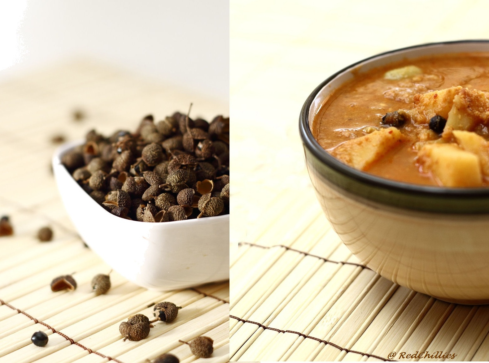 - Meanwhile crush the teppal/triphal in little water using a mottle and pestle and add to the curry along with the water. Let this boil for 5 minutes and then close the lid.